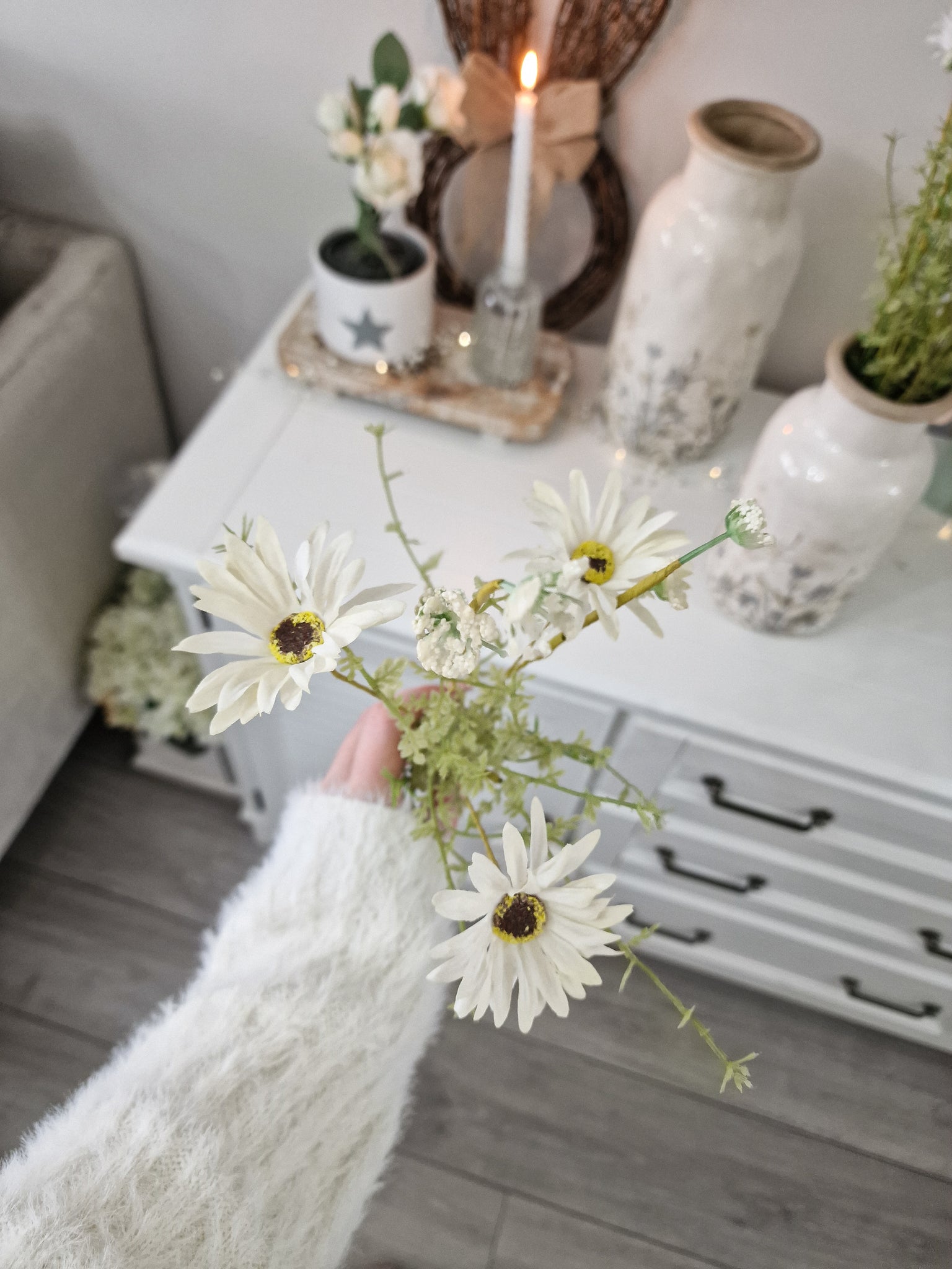 A high quality stem of rustic wild Ivory daisies. Perfect for using all year round and look very realistic just like dried flowers. These bunches are perfect for displaying in vases, long trugs or baskets and can be shortened to your desired length.