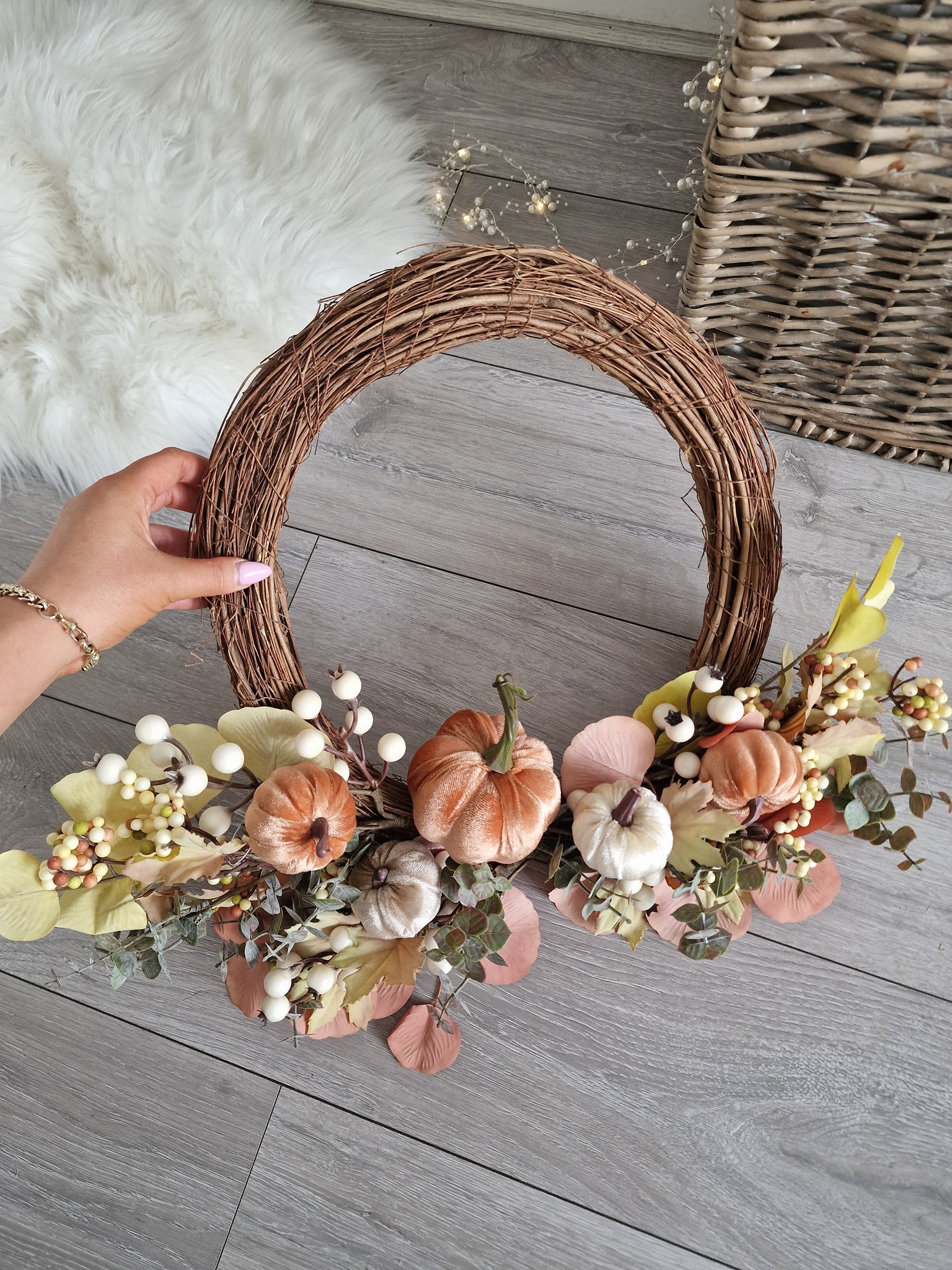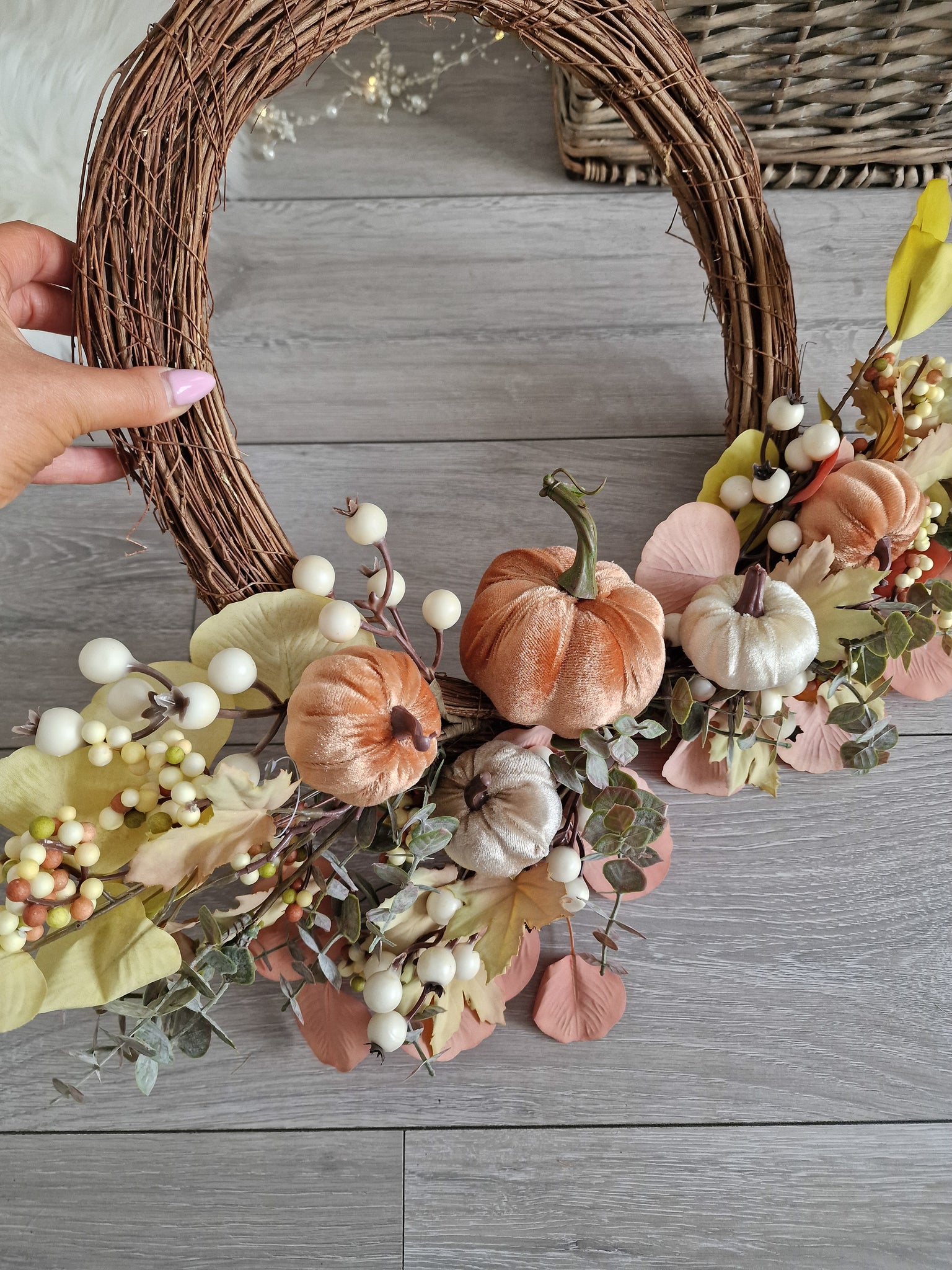 This decorative willow wreath is perfect for autumn, featuring rustic foliage and pumpkin elements. The natural willow material gives it a charming and seasonal appeal, making it a great choice for a door decoration during the autumn months. The wreath exudes a cosy and inviting vibe, adding a touch of warmth and character to your home decor for the autumn season.