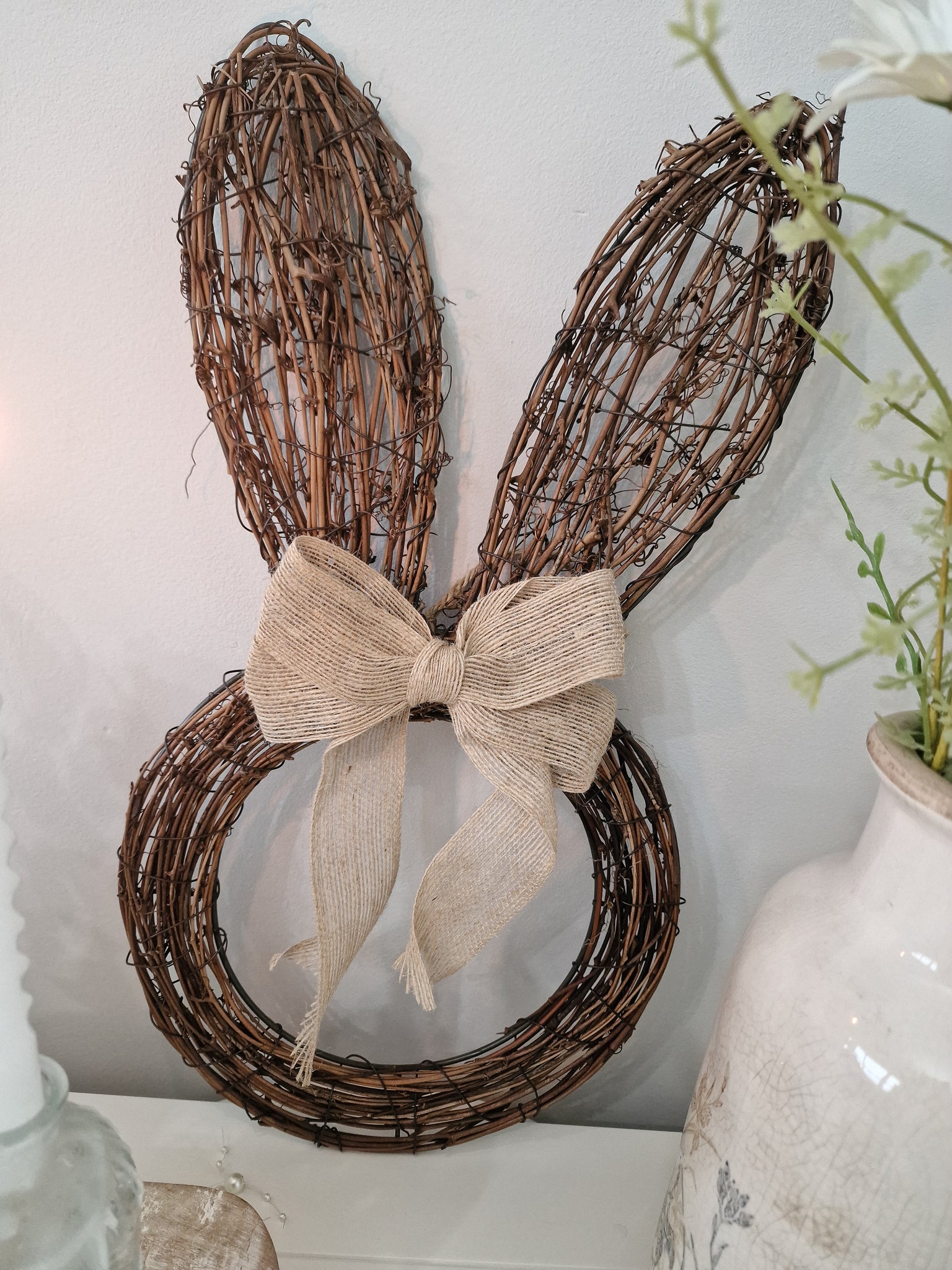 A must have for the Spring/Easter season! Rustic and charming in nature this hessian bow detailed Bunny shaped wreath style decoration can be hung on a wall or door using the twine attached to the reverse, or just simply prop against the wall on a shelf or sideboard.