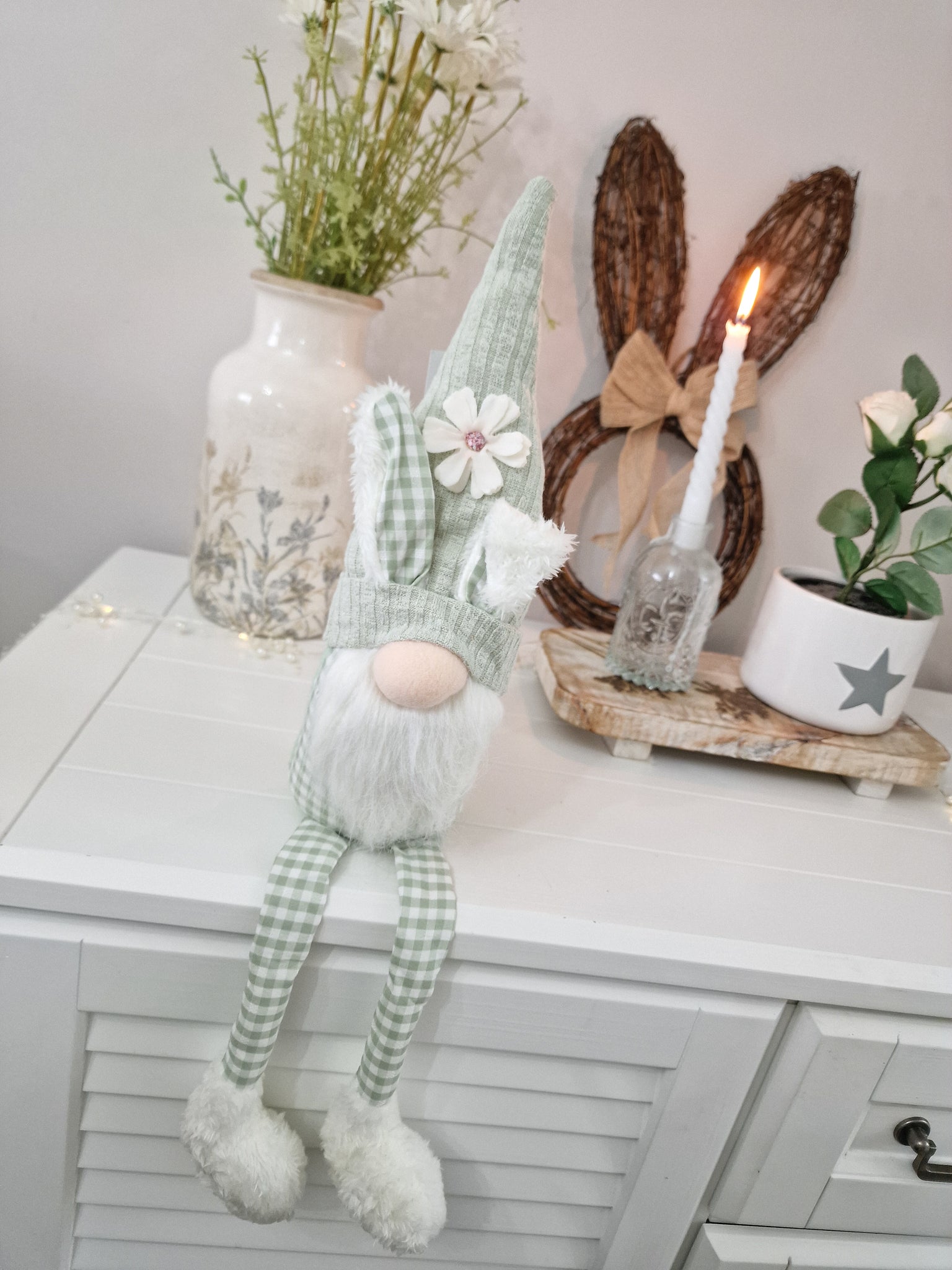 A gorgeous shelf sitting pastel sage green & white gingham Gonk/Gnome decoration. These have been given plush bunny ear detailing making them absolutely perfect for adding to your Spring and Easter decor! The ears can be displayed straight or bent for a cute touch. Finished with a flower detail on the point of his hat.