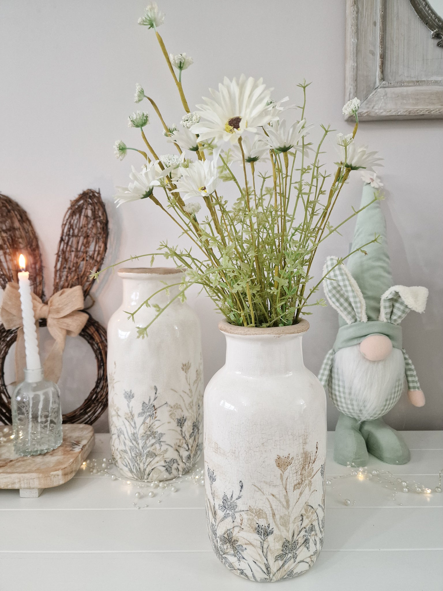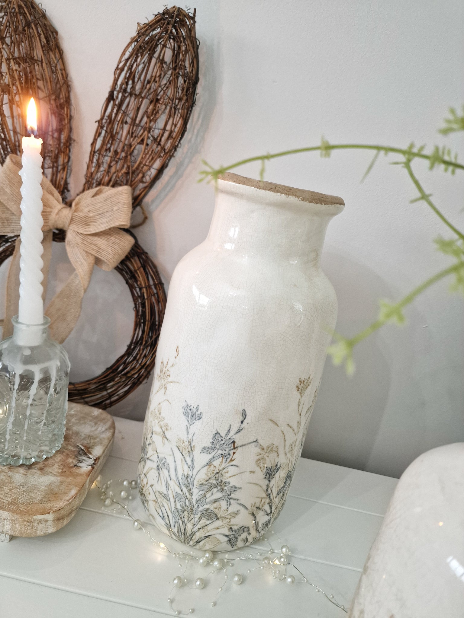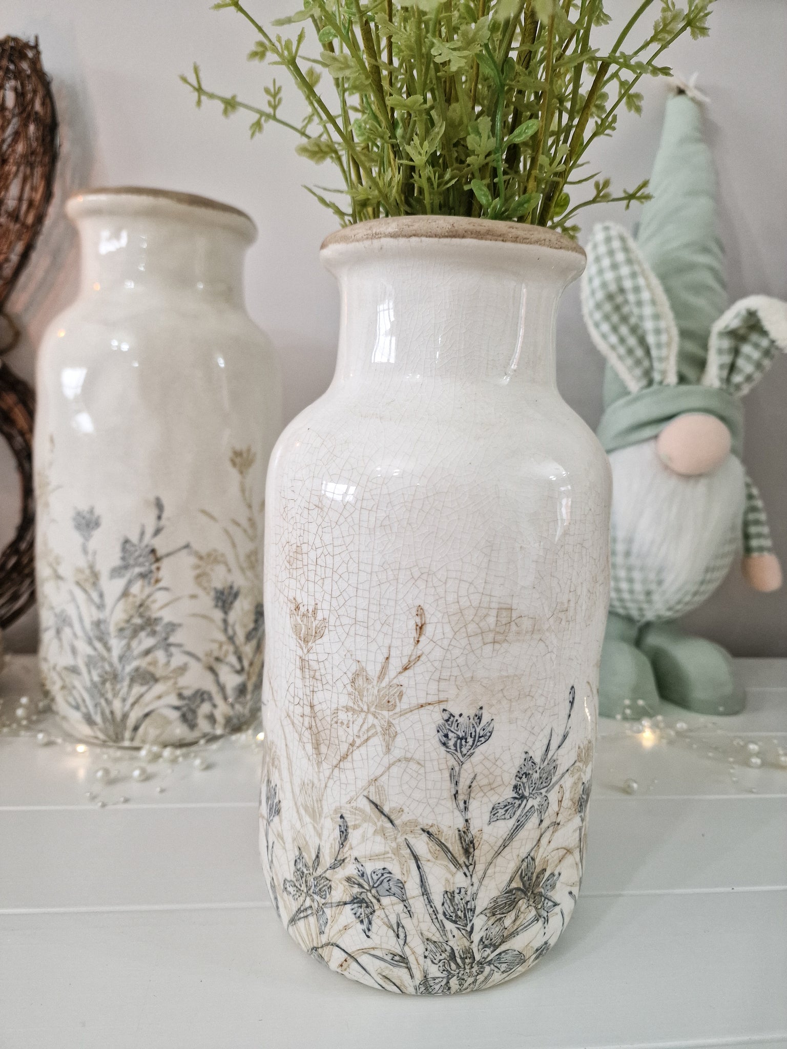 A charming ivory toned rustic tall vase with a rustic, crackle toned ceramic glazed finish. This vase looks stunning either displayed filled or unfilled with your favourite faux or dried flower arrangements. Each one has been given a classy neutral toned, light blue/grey and beige wild flower design around the bottom.